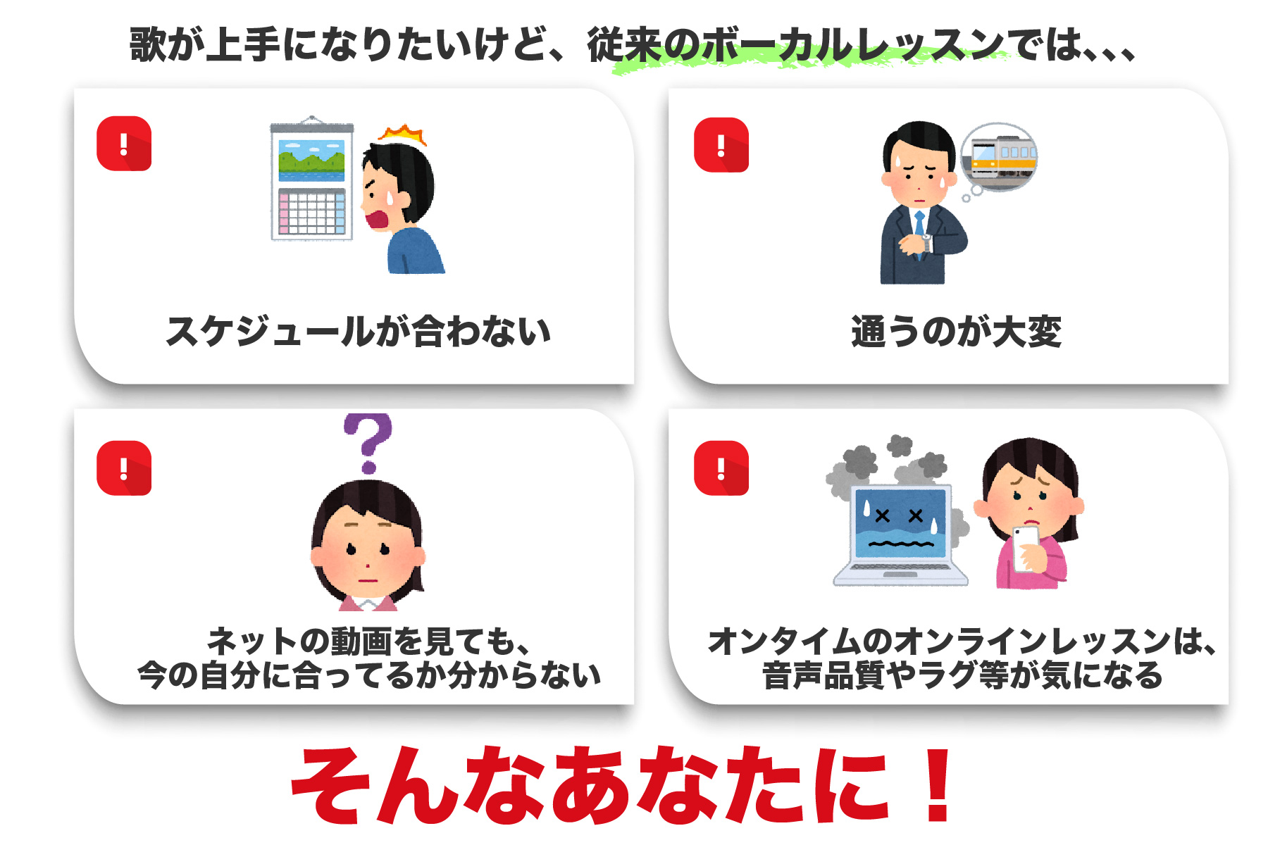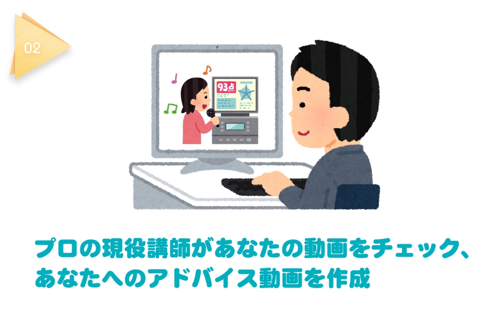 を使ってあなたがご都合の良い時にアップロードした動画に、一週間以内にプロのボーカル講師からアドバイス動画をお送りします(月4回まで)